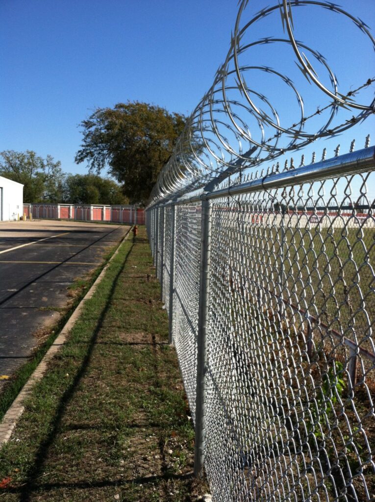 Chain Link with privacy slats, razor wire, or three strand barbed wire